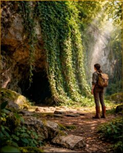 She dropped the vine, grabbed the sickle, and hacked faster, frantic now, not with fear but with recognition. Green cords gave way. A curtain of creepers fell. Behind them, darkness appeared, thin as a crack at first, then widening into a shadowed opening framed in limestone.
