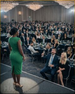 She crossed the stage with calm authority and stood behind the podium while applause continued to thunder around the room. When it softened, she adjusted the microphone and let the silence stretch just long enough to belong entirely to her.