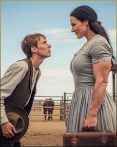 Emmett Sloan had imagined her small, delicate—a woman with gentle hands that would tend his garden, and a soft voice that would fill the endless silence of his lonely ranch. His hopes were simple: companionship, a warm home, and the peace that came with shared labor on the land. But as the dust settled from the wagon wheels and he stepped into the midday sun, his reality shattered. Instead of the gentle, petite woman he had envisioned, standing before him was a towering figure, a woman twice his size.