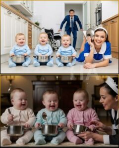 Instead, he saw Clara sitting on the floor in the playroom, surrounded by toys, her legs folded under her. The triplets were arranged in front of her on soft mats, their bodies supported by rolled blankets. They weren’t moving much, but their eyes—those deep, watchful eyes—were fixed on her face.