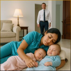 On the floor, in the warm glow of the lamp, lay a young woman in a turquoise uniform. Her head rested against a folded towel, her dark lashes brushing her cheeks as she slept deeply. Curled up against her sides were his two six-month-old boys—his precious twins—wrapped in soft blankets, their tiny fists clinging to her arms.