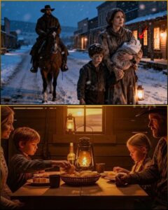 The cowboy stood, and for a second the firelight sharpened the planes of his face. “Lucky ain’t the word,” he said, like he agreed with her and didn’t need to dress it up. Mrs. Adler gestured toward the stairs. “There’s a room upstairs,” she told Eleanor. “Ain’t much, but it’s warm. You and the little ones can stay through the storm.” Eleanor tried to answer, but her throat closed again, so she simply nodded, took the baby back into her arms, and followed the sound of warmth like it was the only hymn she still believed in.