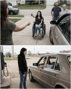 When you finally sit, your body feels too large for the seat, your pulse too loud for the small space. Emily backs out fast, tires crunching, and the speed makes your stomach lift. She drives like she’s late to meet the life she was promised. The houses blur past, then the manicured lawns give way to longer stretches of road, to the outskirts where the town thins into fields and pine trees. You keep glancing at her hands on the wheel, expecting tremors, weakness, proof of the disability you were told to fear. Her grip is firm. Her eyes are alert. She looks like any teenager on a mission, except the mission has teeth.