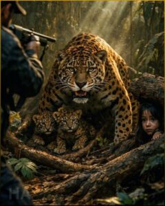 Through the rain and static, Lucy heard it before she saw it: the jaguar’s roar, not distant now, but raw and close, layered with the high, frantic cries of a cub. Flashlights swung through the trees. A shot cracked once, then again.