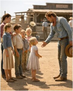 The auctioneer, Mr. Dodd, had a voice built for ordering the world around, the kind that could sell a bull or a piano with the same cheerful cruelty. “Fine breeding stock, gentlemen. Twenty dollars to start,” he called, and hands went up like reflexes. Caleb barely tracked the bids. His mind kept wandering to Hannah’s last day, to the way she’d tried to smile and failed, to the way she’d reached for his hand and whispered, “Don’t turn into stone, Caleb. Stones don’t grow anything.” He’d nodded like he understood, but grief is a language you don’t learn until you’re forced to speak it. A gust stirred the sagebrush smell and brought with it the sour tang of horse sweat and old manure, the bitter perfume of a town that survived by turning need into currency. Then a commotion rippled near the courthouse steps, not loud at first, just a hush that spread like spilled water. Caleb followed the line of people’s stares and saw a woman standing straight as a fence post in a faded dress that had been mended so many times it looked quilted by necessity. Five children held to her in a tight cluster: a teenage girl with serious eyes; two skinny boys who stood shoulder-to-shoulder like they’d been born guarding each other; a little blonde girl hiding behind the woman’s skirts; and a baby on the woman’s hip, fists clenched in the heat.