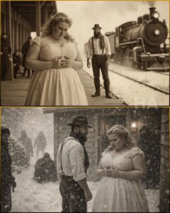 Her name was Bellar Mayfield, though she’d practiced signing it as “Mrs. Carver” on scraps of paper during the long ride west, like a child testing a new pair of boots. She had chosen her dress with the most hopeful logic she could afford. Pale lavender, pressed and careful, because the catalog claimed it softened round faces and made a woman look “gentle.” Bellar had always been described as “gentle” by people who meant “easy to overlook,” and “round” by people who meant worse. The fullness of her figure seemed to catch the sunlight unfairly, casting longer shadows than most, as if her body itself was a kind of accusation against the world’s narrow imagination. She stood beside a chipped sky-blue trunk borrowed from her aunt, the wood groaning under the weight of everything she’d carried: her spare dress, her hymnbook, the letters that had lured her here, and the last few coins she hadn’t spent on the stagecoach from the last station to this one.