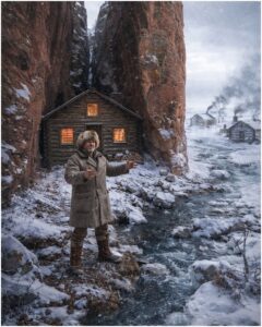 He hurried, boots crunching hard snow, and found the cabin door half-hidden between the granite faces. He knocked with numb knuckles.