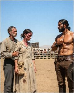 A man stood apart from the crowd, near the fence line where the shadows pooled. Tall. Broad shouldered. A hat pulled low enough to shade his eyes. His clothes were worn thin but clean, as if poverty had touched him but not defeated him.