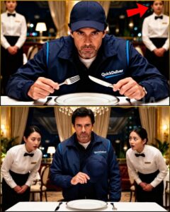 He wore a navy delivery jacket with QUICK DELIVER stitched across the back in white thread. His suits, the thousand-dollar ones Lauren teased him about, were replaced by worn jeans and scuffed sneakers. A baseball cap sat low on his head, shadowing his face. His posture even changed, subtly, the way you stand when you don’t want to take up space.