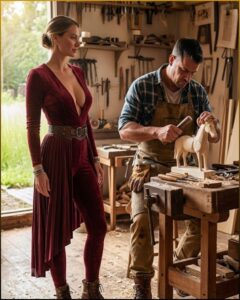 A man stood at the far bench, back turned, bent over a piece of wood with a concentration so complete it seemed almost reverent. He wore worn jeans and a flannel shirt rolled to the forearms. His shoulders were broad, not gym-built but work-built, shaped by repetition rather than vanity. When he turned at the sound of her steps, Vivian experienced the disorienting sensation of meeting someone who looked entirely unlike the men in her world and more substantial than all of them put together.