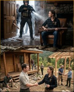 I stood on the porch under the broken frame of my door, tea steaming in my hand, snow turning silver in the spotlights. Behind me the cabin glowed warm and solid, a wounded thing still standing.
