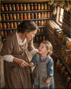 She preserved everything. Tomatoes, beans, peaches, berries, cabbage, apples, trout, venison. She learned exact salt ratios, smoking temperatures, drying times. Iris helped with solemn pride, washing jars, sorting beans, asking endless questions.