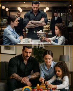 The cafe quieted like someone had pressed a mute button. He arrived like a weather change: tall, impeccably bare of softness. Clean black shirt, sleeves rolled, tattoos like a map under the cuffs. The room’s rhythm shifted; conversations cut off. He moved with the certainty of a man used to having the world step aside.