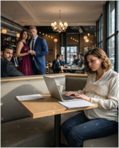 “Where?” Ryan’s tone sharpened. “Got another shift at some dead-end job? I heard you’re doing translation work now.” His gaze flicked to her laptop, then to her secondhand clothes. “Must pay really well, judging by… everything.”