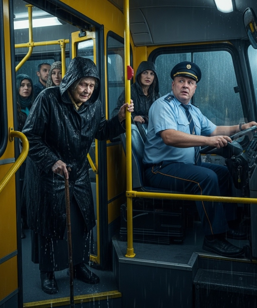 The elderly woman nodded quietly, as though she had expected this outcome. She turned slowly, her movements heavy with fatigue, and began to step back down into the rain. The bus doors loomed before her, wide and unwelcoming.