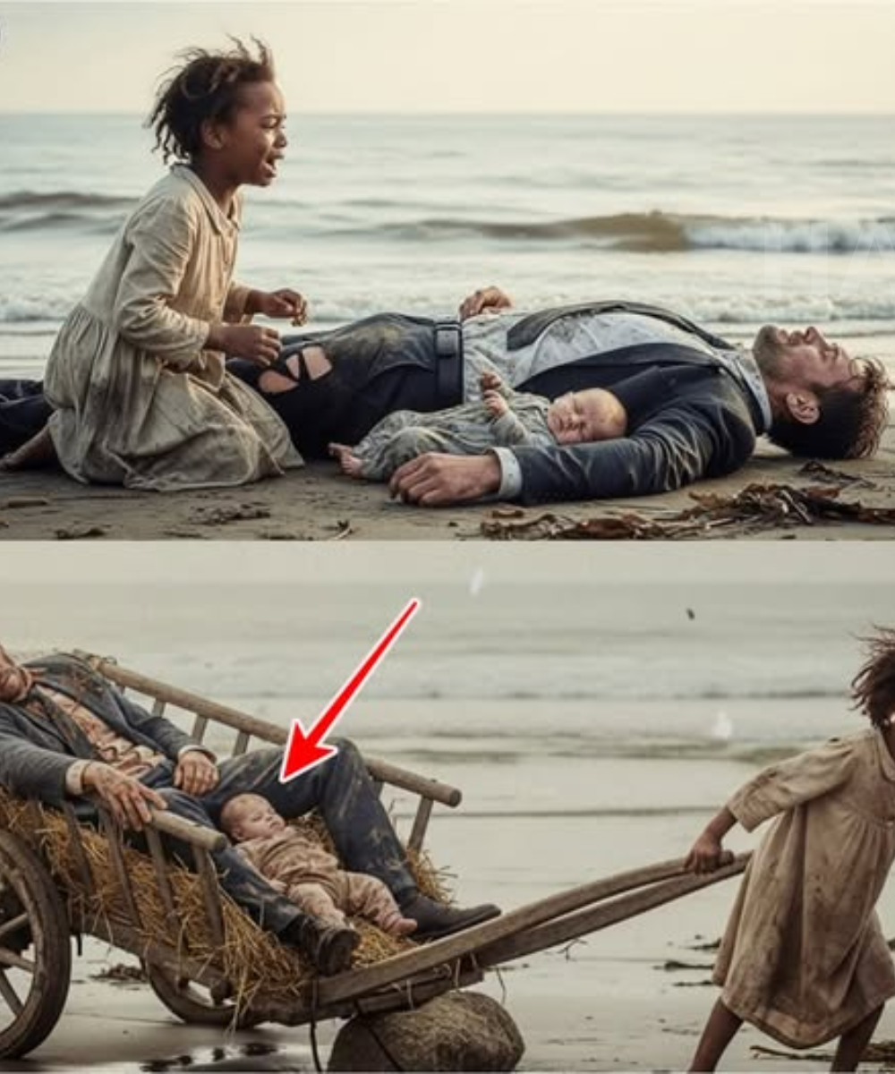 Anna’s arms ached from pulling, but she didn’t dare stop. The wagon creaked. The rusted wheels clattered against shells and broken wood as she dragged the unconscious man up the dune path. The baby lay swaddled in a damp towel beside him, unmoving, silent. Every few steps, she looked down, hoping for some flicker of life. None came. Her chest felt tight. She told herself she was only moving them to get them off the beach, away from the tide. That was all. But a small, stubborn voice inside whispered something else.