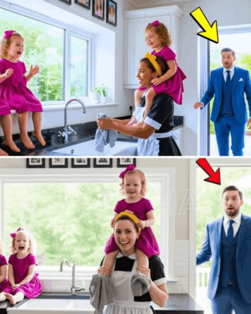 This woman, this stranger, had done what he couldn’t. She’d brought his daughters back from the dead. While he was closing deals and flying across the world, she was here loving them, healing them, being the parent he should have been. And he hated her for it. “What the hell is going on here?” William’s voice exploded across the kitchen like a gunshot. The singing stopped. Michelle’s face crumpled. Moren trembled, setting Michelle down carefully. Mary and Edith froze. “Mr. Scott…” Moren’s voice was quiet, but William saw her shaking. “This is completely inappropriate,” he snapped. “You were hired to clean, not to play dress-up and turn my kitchen into a daycare circus.” Moren lowered her eyes. “I was just spending time with them, sir.” “I don’t want to hear it,” William barked. His fists clenched. “Putting my daughters on counters, carrying them around—what if one fell? What if something happened?” “Nothing happened, sir. I was being careful.” “You’re fired.” The word came out cold, final. “Pack your things. Leave now.”