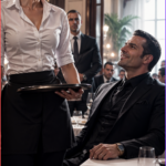 She stands near the front of the room in her pressed cream dress, chin raised, rosary glittering at her wrist like a weapon blessed by gossip. Beside her, Commander Morales holds the envelope with the importance of a man who knows the rich can make paper heavier than truth.