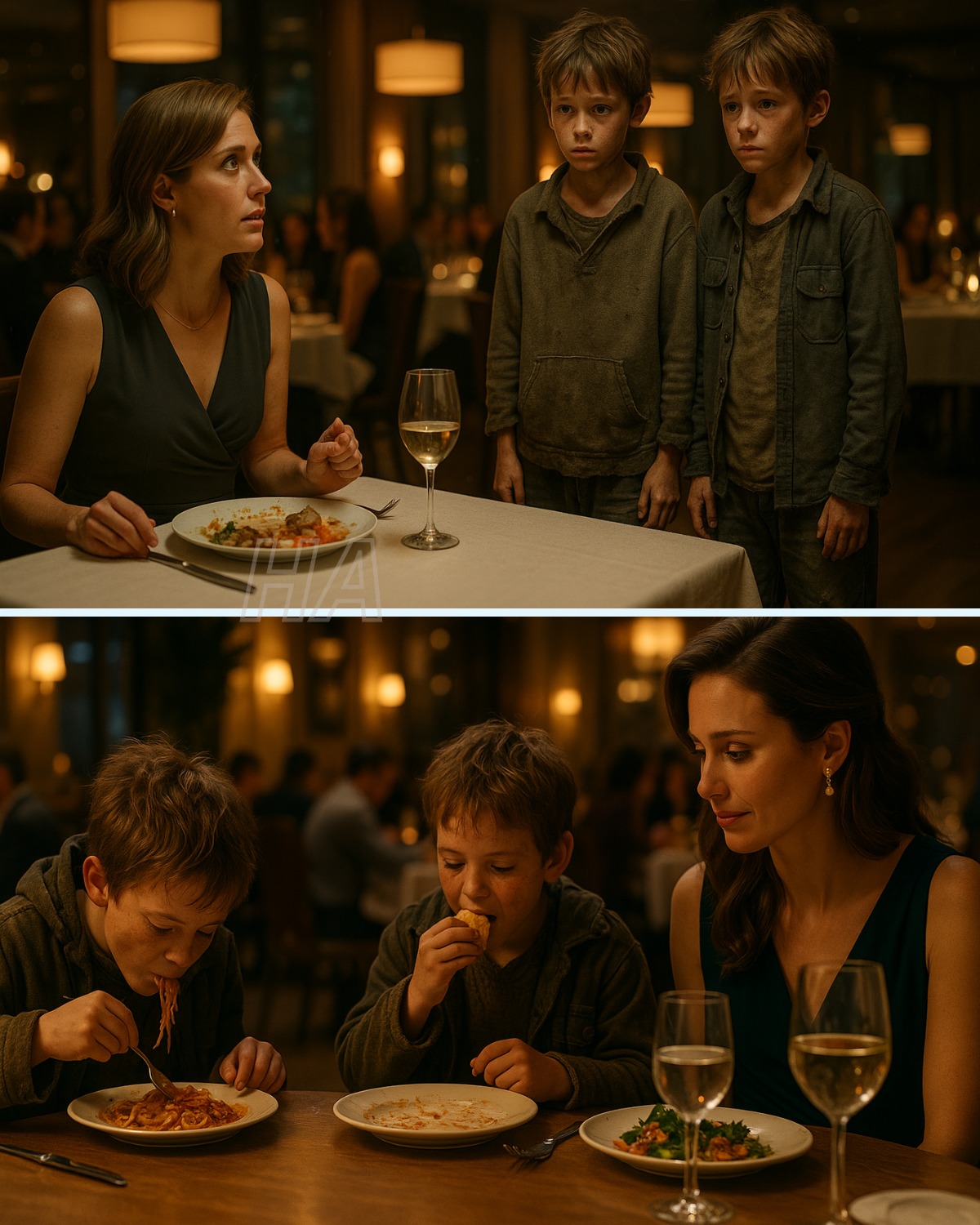 She paid the bill — ignoring the waiter’s raised eyebrows — and led the boys out into the night. The city’s air hit them like a second awakening: cold, damp, alive with traffic noise and the smell of rain. The restaurant’s golden light spilled briefly over the sidewalk before the door shut behind them, sealing the warmth inside.