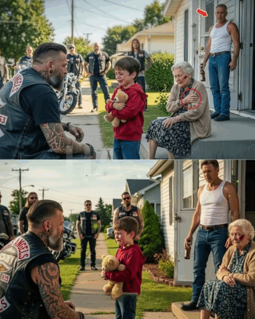 The words Hell’s Angels were stitched across the back of his leather vest, and under that, a smaller patch that read RL. CH lls. His name was Reed, the kind of man whose very presence silenced noise and stirred something raw in the air. When he saw the boy crying by the steps, he killed the engine, swung his leg off the bike, and crouched down.