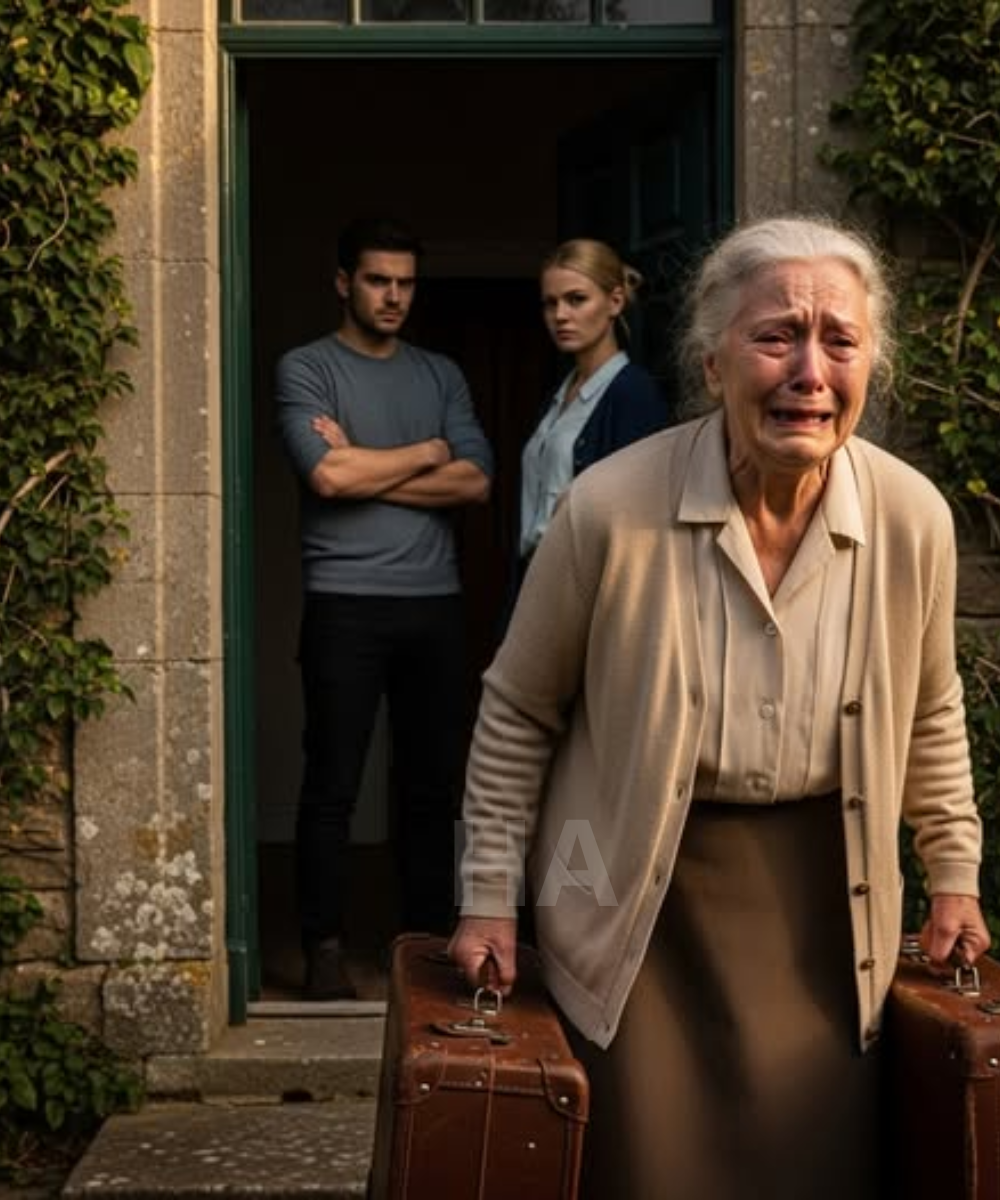 She walked out carrying two old suitcases, one in each hand. They had no wheels, they were heavy, the kind made of hardened canvas with seams on the verge of tearing. She lifted them with effort, arms straining, chest tight.