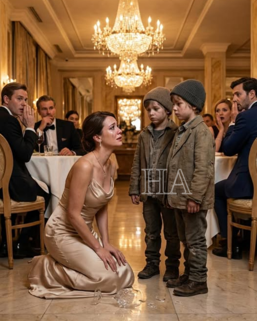Her hand jerked, and the stem of her wineglass slipped from her fingers, shattering against the marble floor with a crack that seemed indecently loud, and a server rushed forward, apologies tumbling from his lips, but she barely registered him, because the boy on the left had leaned protectively toward his brother at the sound, one shoulder angling forward, a gesture so familiar it made her breath stutter.
