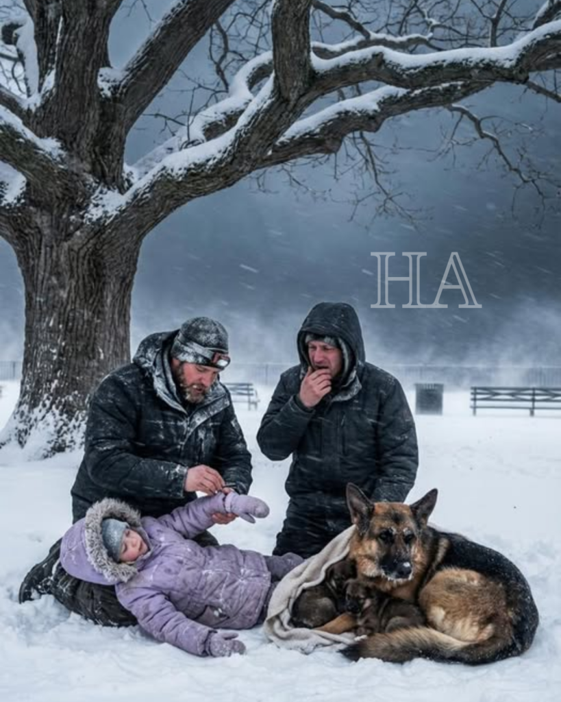 A little girl lay curled against the Shepherd’s flank, her arms wrapped instinctively around the puppies as if she had joined the circle willingly, her face pale, lips tinged blue, eyelashes crusted with frost. She couldn’t have been more than nine or ten.