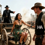 You see a battered wagon serving as a stage, and on it stands Josa Blackwell, polished boots, clean hands, and a smile that never has to fear consequences. He looks like every man who has learned power is just a language others are forced to speak. Two of his hired riders hold a thick chain that drops from the wagon to the dirt below. At the end of it is a young woman, barely upright, wrists locked in iron, shoulders tight with pain she refuses to display. Her cheek is swollen, her lip split, dried blood clinging to the corner of her mouth like a cruel punctuation mark. And still, her eyes are bright, not empty, not broken, just furious and frightened in equal measure. Blackwell announces he’s selling “reclaimed property,” like he’s auctioning a saddle that fell off a wagon, and the men around him shift and look away. Nobody bids, not because they are good, but because they are afraid of being seen participating. Fear has a way of wearing the mask of morality.