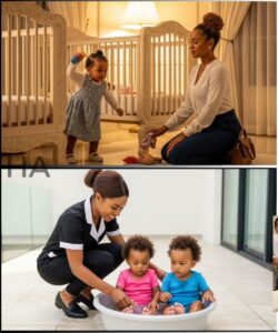 Grace was there in her simple uniform, hair damp, cheeks bright with effort and joy. The twins sat in the blue basin, soaked, shrieking with laughter as Grace wiggled the hose like a ribbon. She pretended the spray was rain from a friendly cloud. Bella slapped the water, giggling so hard her whole body shook. Gabby clapped, her blue cloth draped over her shoulder like a cape.