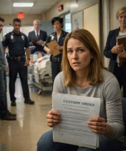 I remember thinking, absurdly, that the hospital hallway looked exactly the same as it had when I ran through it earlier behind the gurney: the same scuffed tile, the same antiseptic smell, the same vending machine humming like nothing in my life had changed. But now there were uniforms and briefcases and the soft scrape of folders being opened. It felt like someone had dragged a courtroom into the ER and set it down under fluorescent lights, ready to decide my daughter’s future before she was even fully awake.