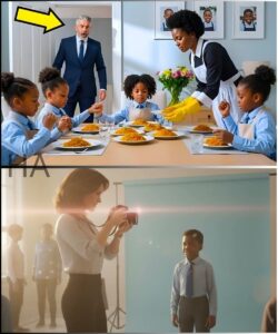 Four Black children sat at his long dining table, about six to eight years old, each wearing a light blue shirt with a white bib apron tied over it like armor. Plates of orange rice steamed in front of them. Their backs were too straight. Their hands stayed close to the edges of their plates. Their eyes were careful, tracking the room as though they’d been warned that one mistake could cost everything.