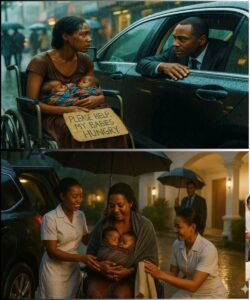 She sat in the rain on a battered wheelchair that had lost its shine years ago, pushed half onto the cracked pavement near a busy intersection off Peachtree. Her dress clung to her body, soaked through, heavy as shame. Her hair, once long and beautiful, hung wet against her cheeks and forehead like the rain had glued it there. Water ran down her neck, down her arms, down her hands.