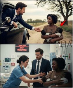 A young Black woman stood in the dust, wearing a simple brown dress that had been worn thin at the seams. Her curly hair was loose and tired, like her hands had given up on taming anything besides survival. Her arms were locked around two babies, both dark-skinned infants in pale, worn clothes. One baby’s head rested limp against her elbow. The other fussed weakly, mouth searching as if even crying took more energy than he had left.