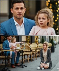 On the sidewalk about twenty feet from their table sat a young woman, probably in her mid-twenties, wearing a tattered beige dress that had clearly seen better days. Much better days. Her blonde hair was pulled back in a messy bun. Her bare feet were dirty from the street, toes curled slightly against the concrete as if even the pavement felt cold, even in summer. In front of her sat a small tin cup with a few coins and a hand-lettered cardboard sign that read: