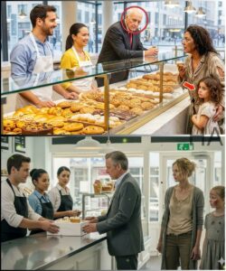 The bell above the door chimed softly. Behind the counter, two employees looked up. A young man with flour dusting his apron offered a polite smile that faded a little when he noticed Marissa’s clothes and Flora’s hesitant posture. The other employee, a woman with her hair in a neat bun, blinked once as if she hadn’t expected someone like Marissa to step into a place where everything was so carefully arranged.