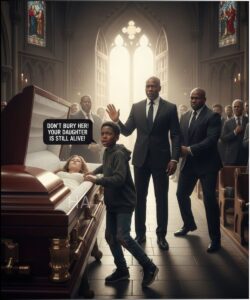 The funeral had been silent—a billionaire mourning the loss of his only daughter—but that silence shattered when a skinny Black kid in torn clothes sprinted down the aisle, shouting in a trembling voice: