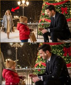 The boy couldn’t have been more than five. He wore a bright red coat that made him look like a moving ornament against the white. Jeans. A beige knit hat pulled down over his ears. In one hand he held a small golden gift bag, crumpled at the top where his fingers squeezed it too hard.