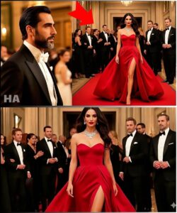 She wore a crimson gown—simple, perfectly cut, elegance distilled into fabric. Her dark hair cascaded in soft waves, her posture effortless. She wore no gaudy jewelry, only small earrings that caught the light like whispered secrets.