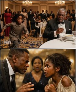 The girl pointed at the silver tureen being carried toward the head table. Her hand shook so violently her finger couldn’t hold steady. The server slowed, uncertain, eyes darting between the billionaire and the barefoot interruption.