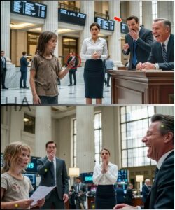 Sunlight poured through the bank’s tall windows, turning the marble floors into pale gold. Columns rose like monuments. Digital screens flickered with stock charts and currency rates. The air smelled faintly of expensive cologne and printer ink.