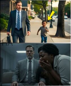The boy kept running, legs shaking, sobbing so hard he could barely breathe. When he reached Richard, he grabbed the front of his suit jacket with both tiny hands, fists clenching fabric like it was the last safe thing in the world.