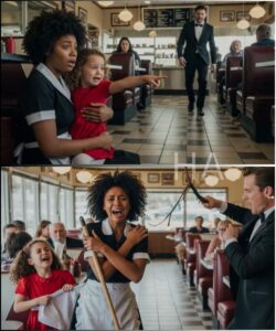 There were no forms. There was a riding crop. There was a calm that didn’t reach his eyes. When he lashed out, the sound of the crop cracked through the diner and Clara moved as if by a single impulse that had been stored in her bones for years: she put herself between Garrett and Emma. The crop found Clara’s shoulder. Blood came and soaked the floral pattern of her apron like a dark flag.