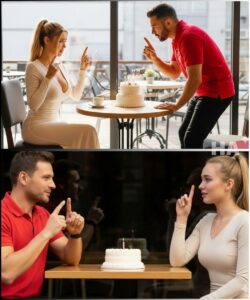 A waiter approached her table. He said something while gesturing at the cake, the way people do when they want a response but don’t know how to ask for one. The young woman pointed to her ears, shook her head, then wrote something on a napkin. The waiter nodded awkwardly and retreated, relief and discomfort mixed together in his expression, as if he’d narrowly escaped an exam he hadn’t studied for.