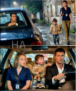 A practical miracle: none of them hesitated. Haley’s apologetic posture softened into wary gratitude; Finn beamed like a small conspirator who had already won. Gabriel took them home. He gave Haley an umbrella—neat, new, the tag still dangling—because he had a dozen things that rarely came out of his leather console that were not expensive so much as deliberate. She took it with that wary, grateful look of someone who had not been offered anything for reasons besides need in a long time.