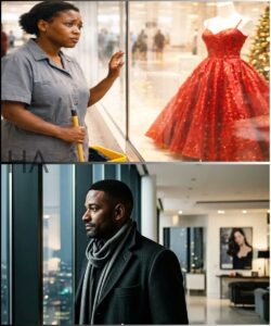 Her reflection hovered beside the dress in the window: rounded shoulders, tired face, oversized uniform, worn shoes. The contrast was so sharp it almost felt cruel.