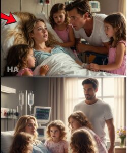 At the foot of her bed stood three identical small figures, their curls bouncing, their coats half-zipped. Lily’s hand was already reaching for the woman’s fingers. Emma had climbed halfway onto the mattress like it was her birthright. Sophie stood still, studying the woman with that unsettling, ancient wisdom children sometimes wear for a moment, like a borrowed crown.