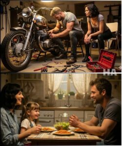 In the corner of the garage, the Harley sat running smoothly now, no longer a symbol of escape but a reminder of where the story began: a breakdown in the rain, and the simple courage to open a door.