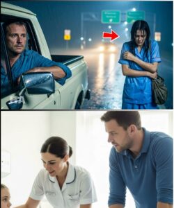 Rain hit the windshield like a thousand impatient fingers, drumming hard enough to drown out the radio and make the streetlights blur into melted gold. Michael Bennett guided his old pickup to the curb with the kind of caution you learn when you’ve spent years making do, repairing what others replace, and counting minutes like they’re money. He was already late in his head, already hearing Emma’s small voice asking why he wasn’t there yet, already rehearsing the apology and the joke he’d use to turn it into an adventure. Then he saw her through the downpour, a woman in scrubs folded under the bus stop shelter as if she’d been carefully placed there by the storm itself. Her shoulders shook, not with the quick shiver of cold, but with the slow, exhausted tremor of someone trying not to break in public. Michael hesitated, one hand tightening on the steering wheel, because promises mattered in his world, and he’d promised his daughter he’d be on time. But the woman’s posture held a strange dignity, like she’d rather drown than beg, and something old and stubborn in him refused to drive past. He rolled down the window and let the rain spray in, cold on his knuckles. “Need a ride?” he asked, expecting the polite refusal people give when pride is the only coat they own. Instead, she lifted her eyes, and the exhaustion there was deeper than any night shift could explain, the kind that comes from losing more than sleep. Neither of them knew that this rainy Tuesday in Portland, Oregon would redraw every border they’d built around their hearts.