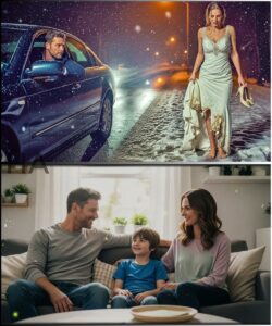 Jason cut the engine and stepped out into the rain before his tiredness could argue with him. The cold hit him like a slap, soaking his shirt under his jacket almost instantly. He walked toward her carefully, palms open, body language gentle.