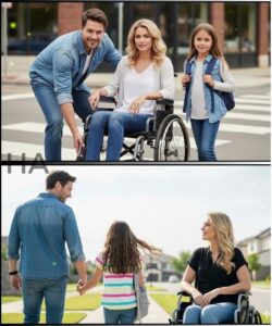 Daniel knelt beside her wheelchair, checking the brakes instinctively, tightening a loose strap near her ankle. He guided the chair carefully down the incline, steadying it until the wheels hit level pavement. When the crosswalk light turned green, he walked beside her, matching her pace, shielding her slightly from passing cars.